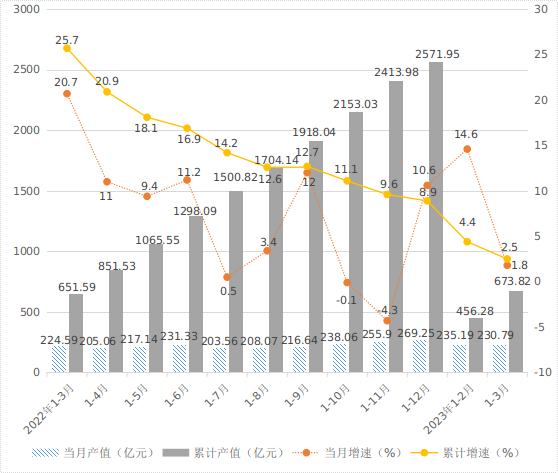 1、工业总产值:一季度,全市规模以上工业企业完成总产值673.82亿元,同比增长2.5%。其中3月当月完成产值230.79亿元,同比增长1.8%。