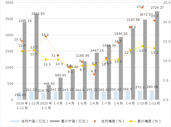 1、规模以上工业总产值:1-11月,全市规模以上工业企业完成总产值2726.27亿元,同比增长13.2%。其中,11月当月完成产值280.98亿元,同比增长20.3%。
