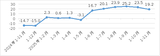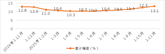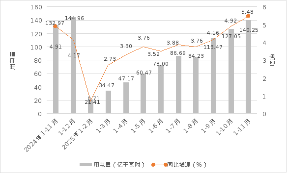 1-11月,全市工业累计用电量140.25亿千瓦时,同比增长5.48%,低于全省平均增速1.14个百分点,增速全省排名第13。其中制造业用电量118.42亿千瓦时,同比增长5.71%。11月当月工业用电量13.2亿千瓦时,同比增长11.1%,高于全省平均增速3.37个百分点,增速全省排名第7。