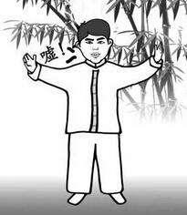 从插掌开始,口吐“呵”字。重复⑤至⑧动4遍。本式共吐“呵”字6次。