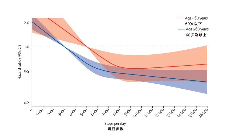 在60岁以上的老年人群中,每天6000-8000步降低的死亡风险最大;对于18-60岁的成年人而言,每天8000-10000步降低的死亡风险最