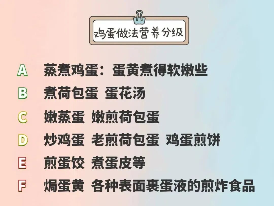 有专家把“鸡蛋做法营养分级”分列如下:营养最高的是蒸煮鸡蛋,煎炸是最不推荐的吃法。