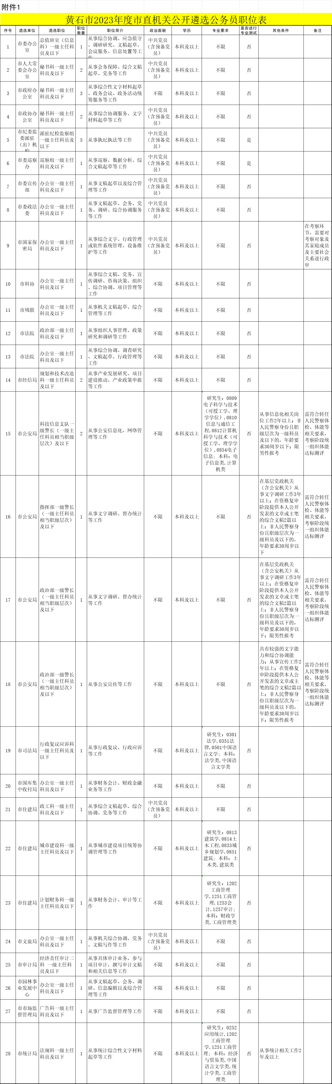 1.黄石市2023年度市直机关公开遴选公务员职位表