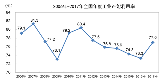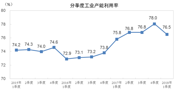 2018年一季度,全国工业产能利用率为76.5%,比上年同期回升0.7个百分点。