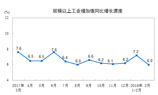 2018年3月份,规模以上工业增加值同比实际增长6.0%(以下增加值增速均为扣除价格因素的实际增长率),比1-2月份回落1.2个百分点。从环比看,3月份,规模以上工业增加值比上月增长0.33%。一季度,规模以上工业增加值同比增长6.8%。