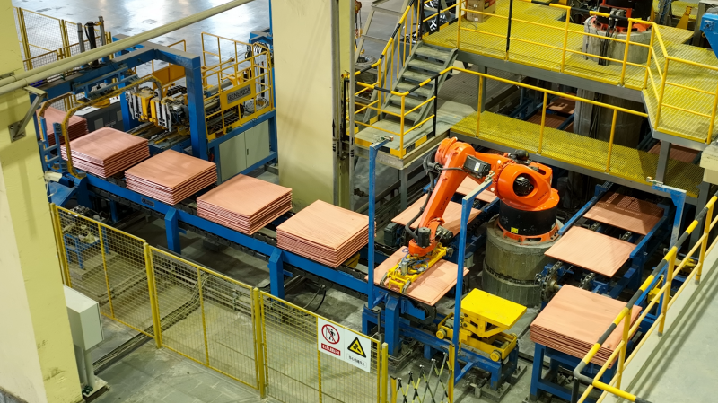9月24日,在黄石新港园区弘盛铜业自动化产线上,机械臂忙碌挥舞。今年以来,弘盛铜业借助工业互联网平台和智能化手段,监测电解液温度、过滤量及循环量,控制最优化工艺条件,提升电解铜质量。目前电解铜主品位保持在99.998%水平,已经达到A+铜标准。