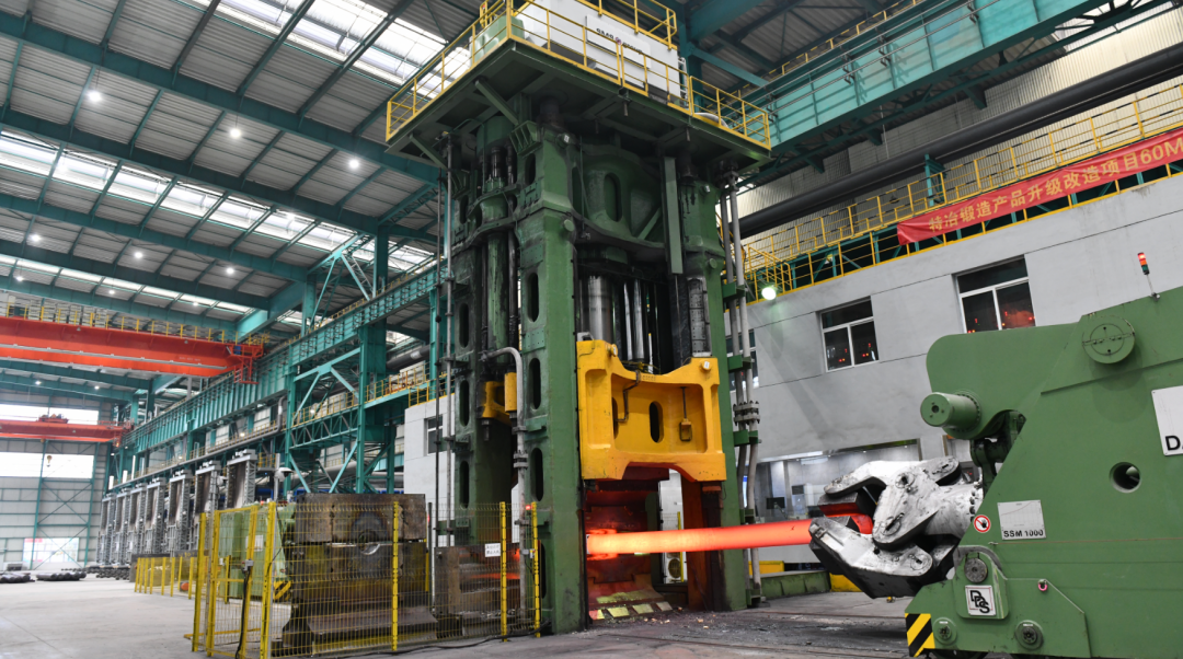 大冶特钢通过数字模拟锭模设计与大压下变形技术,解决了大钢锭大棒材均匀性难题,成功研制出高强韧、长寿命的风电轴承钢。图为该公司60MN快锻机正在锻制轴承钢。
