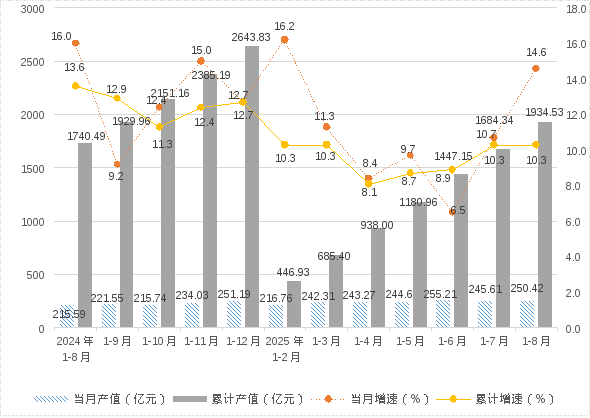 1、规模以上工业总产值:1-8月,全市规模以上工业企业完成总产值1934.53亿元,同比增长10.3%。其中,8月当月完成产值250.42亿元,同比增长14.6%。