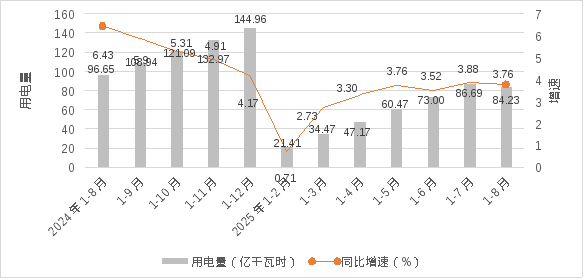 1-8月,全市工业累计用电量100.28亿千瓦时,同比增长3.76%,低于全省平均增速2.49个百分点,增速全省排名第14。其中制造业用电量84.23亿千瓦时,同比增长3.29%。8月当月工业用电量13.59亿千瓦时,同比增长2.98%,低于全省平均增速4.83个百分点,增速全省排名第16。
