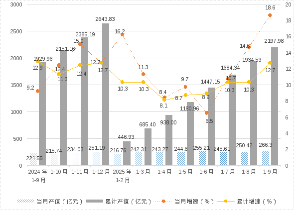 1、规模以上工业总产值:1-9月,全市规模以上工业企业完成总产值2197.98亿元,同比增长12.7%。其中,9月当月完成产值266.3亿元,同比增长18.6%。