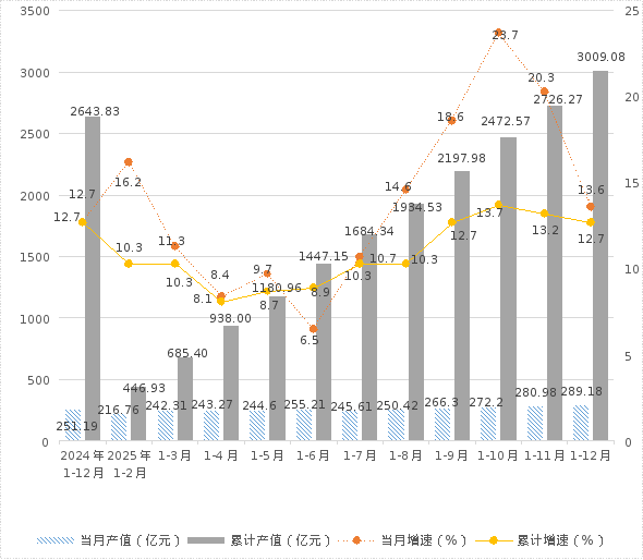 1、规模以上工业总产值:1-12月,全市规模以上工业企业完成总产值3009.08亿元,同比增长12.7%。其中,12月当月完成产值289.18亿元,同比增长13.6%。