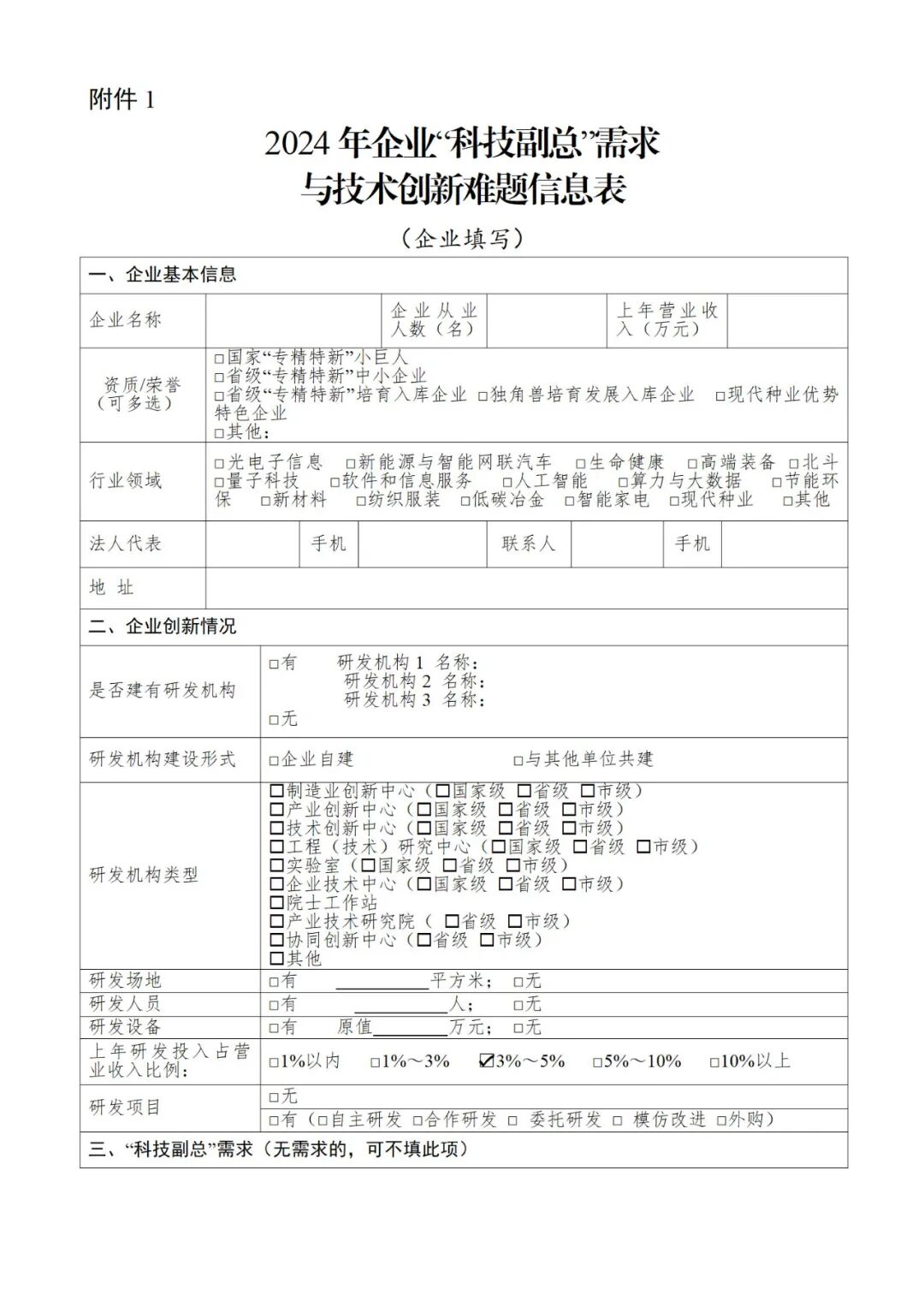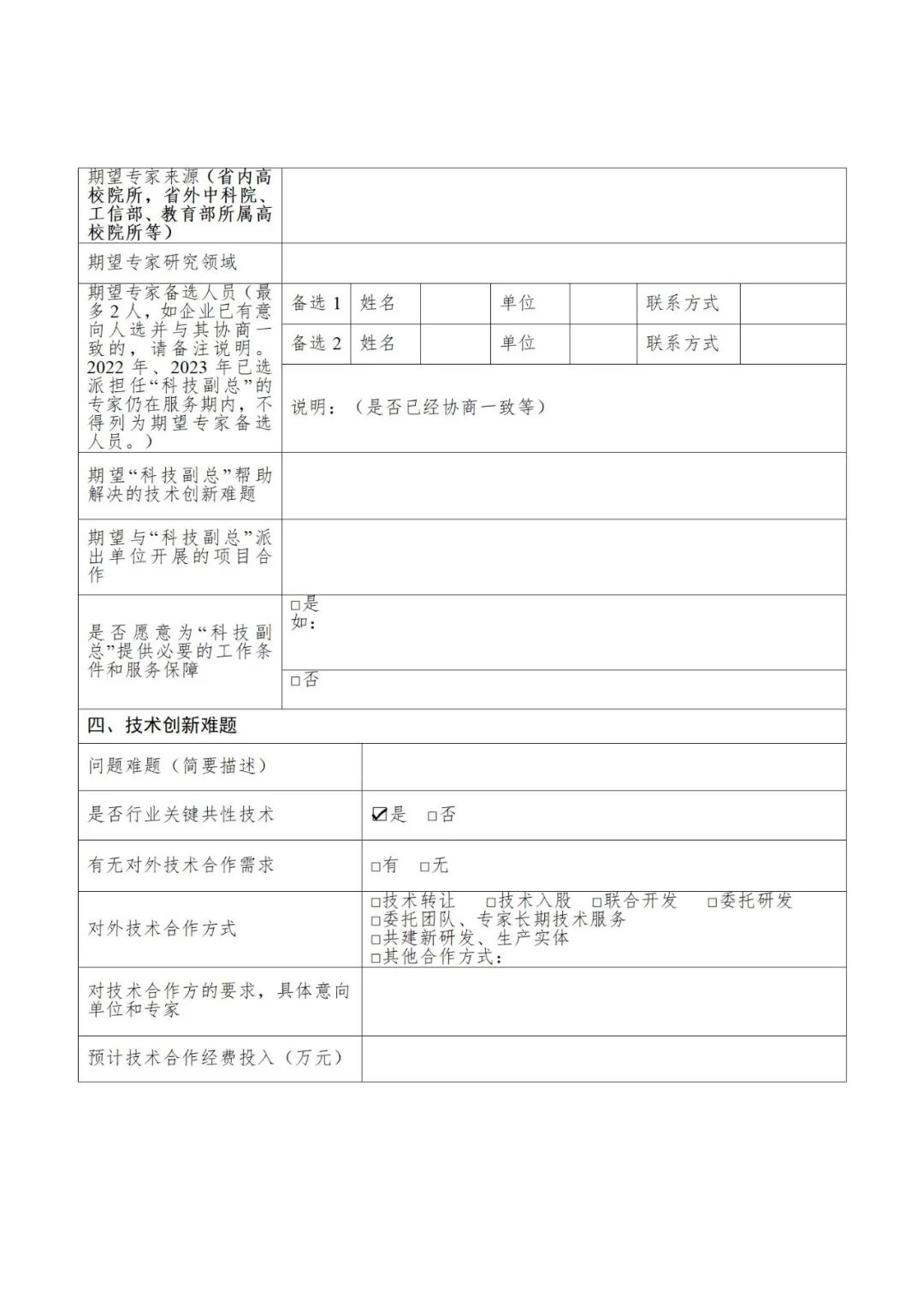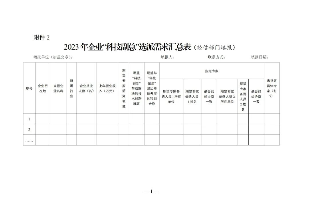 各市、州、直管市、神农架林区党委组织部,经信局,省直各有关单位,各高等学校、科研院所:为贯彻党的二十大精神,落实省委、省政府重要工作部署,充分发挥人才在促进企业创新发展中的重要作用,根据省委人才办、省经信厅联合印发《选派科技人才到中小微企业担任“科技副总”工作实施方案》(鄂经信科技〔2020〕73号)要求,现就开展好2024年有关工作通知如下。重点围绕光电子信息、新能源与智能网联汽车、生命健康、高端装备、北斗等五大优势产业,算力与大数据等九个新兴特色产业,突出专精特新中小企业、独角兽企业,兼顾农业现代种业优势特色企业,从高等学校、科研院所选派200名左右科技人才,对口担任中小微企业“科技副总”,帮助解决技术难题,推动产学研深度合作,培养引进创新人才,推动产业高质量发展。“科技副总”从省内外高等学校、科研院所中选派,应具备以下资格条件:(一)政治素养好、专业能力强,具有吃苦奉献精神和服务基层意愿,能够适应基层工作环境;(二)一般应具有副高级以上专业技术职称,拥有发明专利、专利技术或科研成果,研究领域与有关企业需求高度契合;尚在服务期内的“科技副总”不得申报。服务期满考核验收合格的“科技副总”可再次申报。“科技副总”以合约方式服务企业,在当地经信部门指导下,被服务企业商选派的“科技副总”,明确任务清单,签订合作协议。“科技副总”通过深入企业开展一线讲学、专题培训、技术诊断指导、项目合作等形式提供服务,同时鼓励开展在线咨询服务。服务期2年。原则上每月在企业服务时间不少于7天,帮助企业解决实实在在的问题。(一)征集企业需求。省经信厅指导各地围绕五大优势产业、新兴产业,突出专精特新中小企业、独角兽企业,兼顾农业现代种业优势特色企业,组织征集企业“科技副总”需求和技术创新难题。各地企业需求由市州经信局会同当地党委人才办审核后报送省经信厅。前四批已接收过科技副总服务的企业,可参与征集技术难题,不再选派科技副总。(3月16日前完成)(二)推荐专家人选。省经信厅在对各地企业需求进行甄别基础上,确定纳入省级活动的需求清单,推送至相关高校院所,商请推荐专家人选。专家所在单位综合考虑企业需求和人才专长,研究推荐专家人选。(4月20日前完成)(三)供需方对接确认。省经信厅将高校院所推荐的专家有关情况点对点向地方和企业反馈,由地方、企业与专家进一步沟通对接,确认匹配契合度和合作意向。(4月25日前完成)(四)确定选派人选。省经信厅根据各地征集需求数量占全省需求总量的比例,会同当地党委人才办确定各地选派“科技副总”的名额,指导各地明确企业和选派专家匹配名单,省经信厅会同省委人才办联合印发选派名单。(4月30日前完成)(五)人选到岗履职。省经信厅指导各地组织企业与专家合作签约,督促企业衔接专家到岗履职,“科技副总”到企业开展技术服务。(六)做好跟踪服务。省经信厅组织开展“科技副总”线上培训,介绍有关政策和工作要求,组织开展经验交流。指导各地做好“科技副总”到岗服务的衔接和配套支持工作,充分发挥“科技副总”作用,及时跟踪了解服务情况,实行双月调度,宣传有关典型经验,解决有关问题。(一)经费支持。服务期内给予每名“科技副总”工作保障经费5万元,按年度、分2次拨付至“科技副总”个人账户。鼓励各地及有关企业为“科技副总”提供适当待遇。(二)评价引导。选派人员的人事与工资关系保留在原单位,职务晋升、职称评聘等不受影响。选派人员在服务期内工作情况和取得的科研创新成果、产生的社会效益、经济效益等价值贡献,作为其在派出单位晋职、职级、评聘和晋升专业技术职务的重要依据。(三)发展激励。选派人员促成的科技成果转化项目,可按技术合同标额的一定比例享受地方资助;为地方引进和举荐急需紧缺人才,可申领地方奖励;允许国有企业事业单位专业技术人才按规定兼职兼薪、按劳取酬。对服务成效显著的专家进行宣传推介,并适时通报表扬。各地各单位要高度重视,加强领导,精心组织,认真做好“科技副总”需求和创新难题需求征集工作,指导企业找准问题、明确要求、提准需求,以实现“对接匹配准、工作推进实、服务成效好”的目标。有条件的市州可同步组织开展地方“科技副总”选派工作,需求一并征集,专家一并推荐,因名额有限未入选省级“科技副总”名单的专家,各地可直接确定为地方“科技副总”人选。要加大“科技副总”履职的配套服务保障,用好用足专家资源,提升企业技术创新能力。要加强宣传谋划,及时发掘优秀典型,积极宣传为企业发展做出突出贡献的专家典型,营造科技人才服务企业的良好氛围。请各地组织本地企业认真填写相关需求,于3月16日前汇总报送省经信厅(含电子版)。联系人:省经信厅科技处 陈起 027—878158591.2024年企业“科技副总”需求与技术创新难题信息表(企业填写)2. 2024年企业“科技副总”选派需求汇总表(经信部门填报)