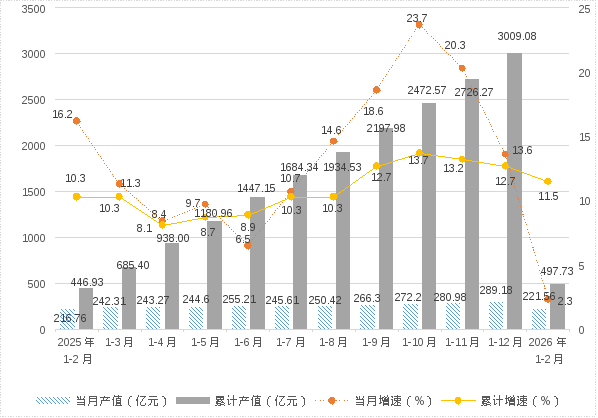 1、规模以上工业总产值:1-2月,全市规模以上工业企业完成总产值497.73亿元,同比增长11.5%。其中,2月当月完成产值221.56亿元,同比增长2.3%。