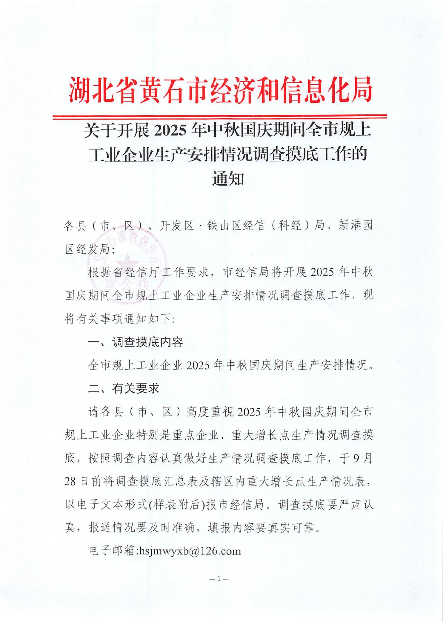 关于开展2025年中秋国庆期间全市规上工业企业生产安排情况调查摸底工作的通知
