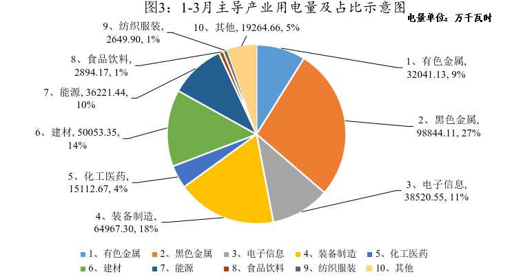 1-3月,九大主导产业用电量累计增幅在两位数以上的有3个:电子信息、建材、食品饮料,分别同比增长20.01%、19.94%、13.99%。
