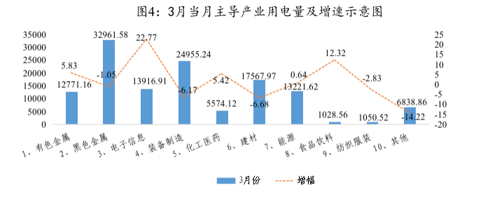 3月份,九大主导产业实现增长的有5个,分别为:电子信息、食品饮料、有色金属、化工医药、能源,分别同比增长22.77%、12.32%、5.83%、5.42%、0.64%。