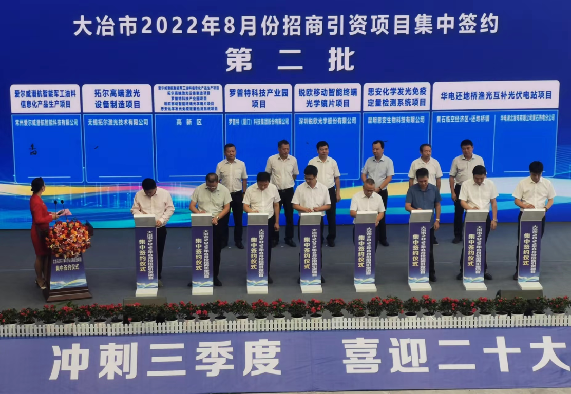 2日,大冶市2022年8月份招商引资项目集中签约仪式在高新区举行,罗普特科技产业园项目、锐欧移动智能终端光学镜片项目等15个项目集中签约,总投资102.35亿元。