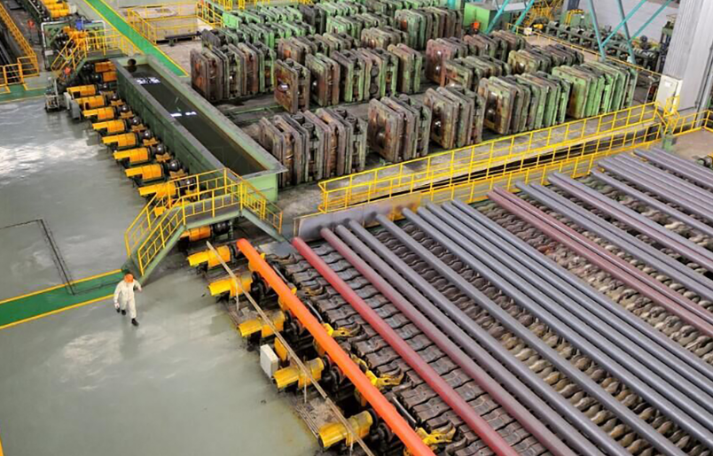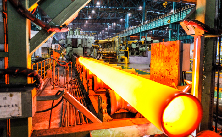 大冶特钢460钢管厂,一根高端中厚壁无缝钢管穿轧成型。