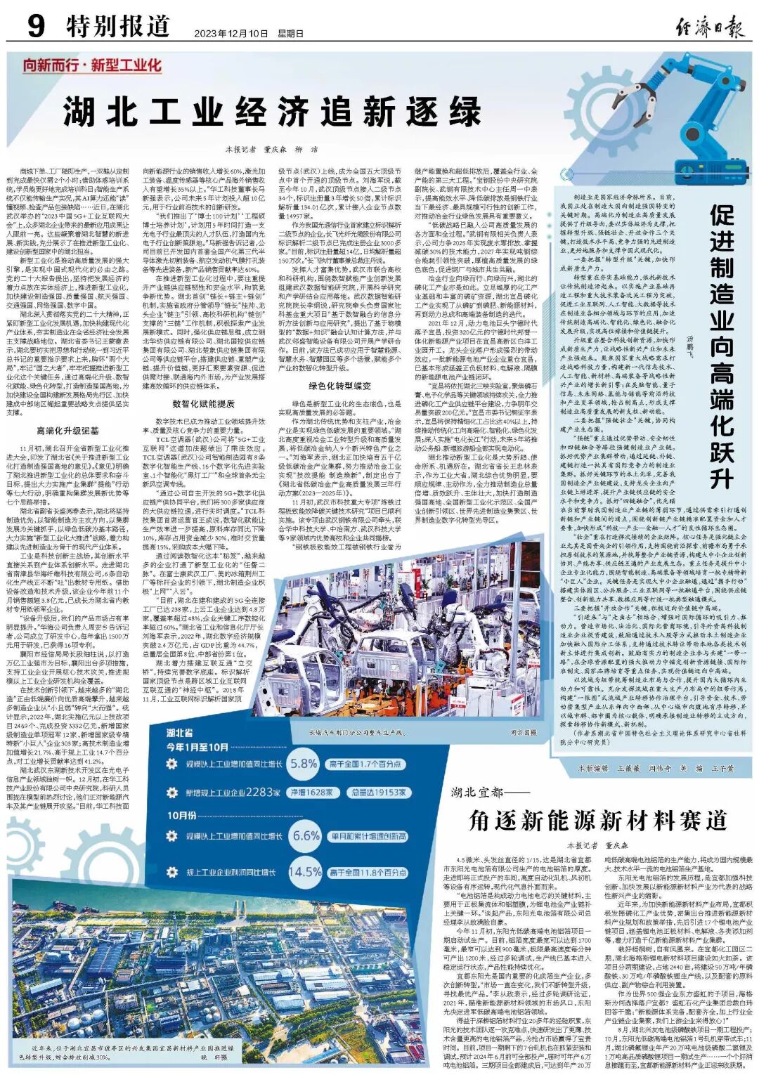 12月10日,《经济日报》刊发特别报道《湖北工业经济追新逐绿》一文,聚焦湖北围绕推进新型工业化关键任务,通过高端化升级、数智化赋能、绿色化转型,打造制造强国高地展开深度报道。全文如下: