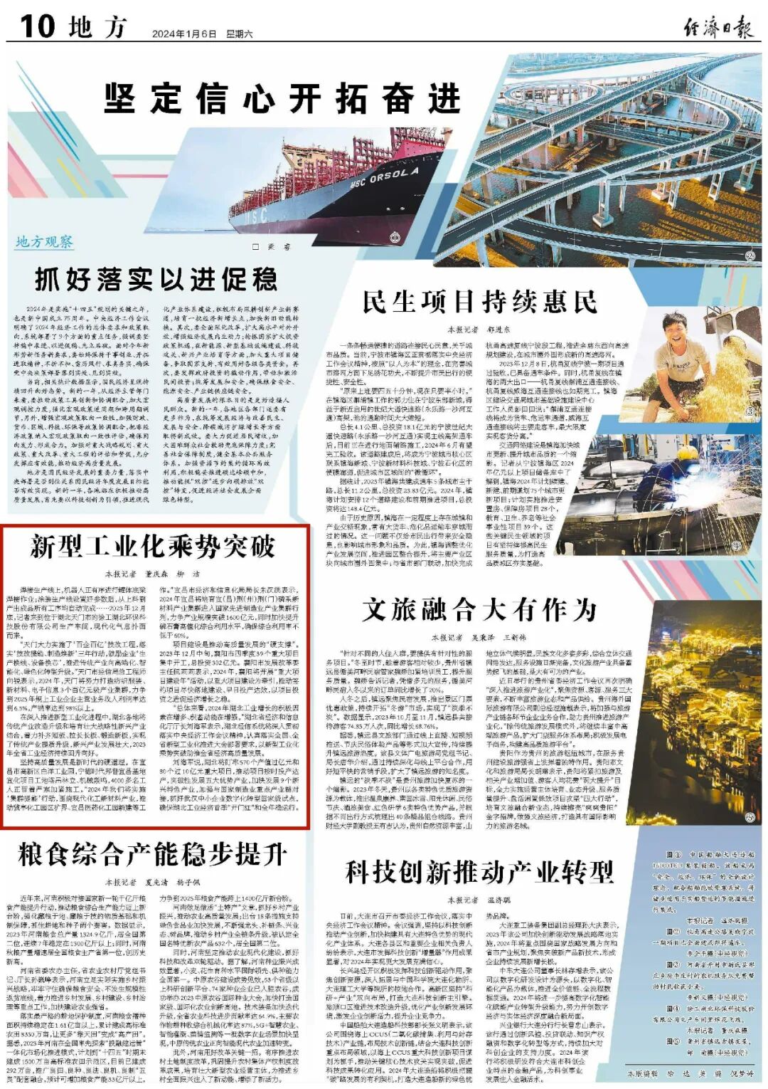 “总体来看,2024年湖北工业增长的积极因素在增多、积蓄动能在增强。”湖北省经济和信息化厅厅长刘海军表示,湖北经信系统将深入贯彻落实中央经济工作会议精神,认真落实全国、全省新型工业化推进大会部署要求,以新型工业化乘势突破助推全省经济高质量发展。