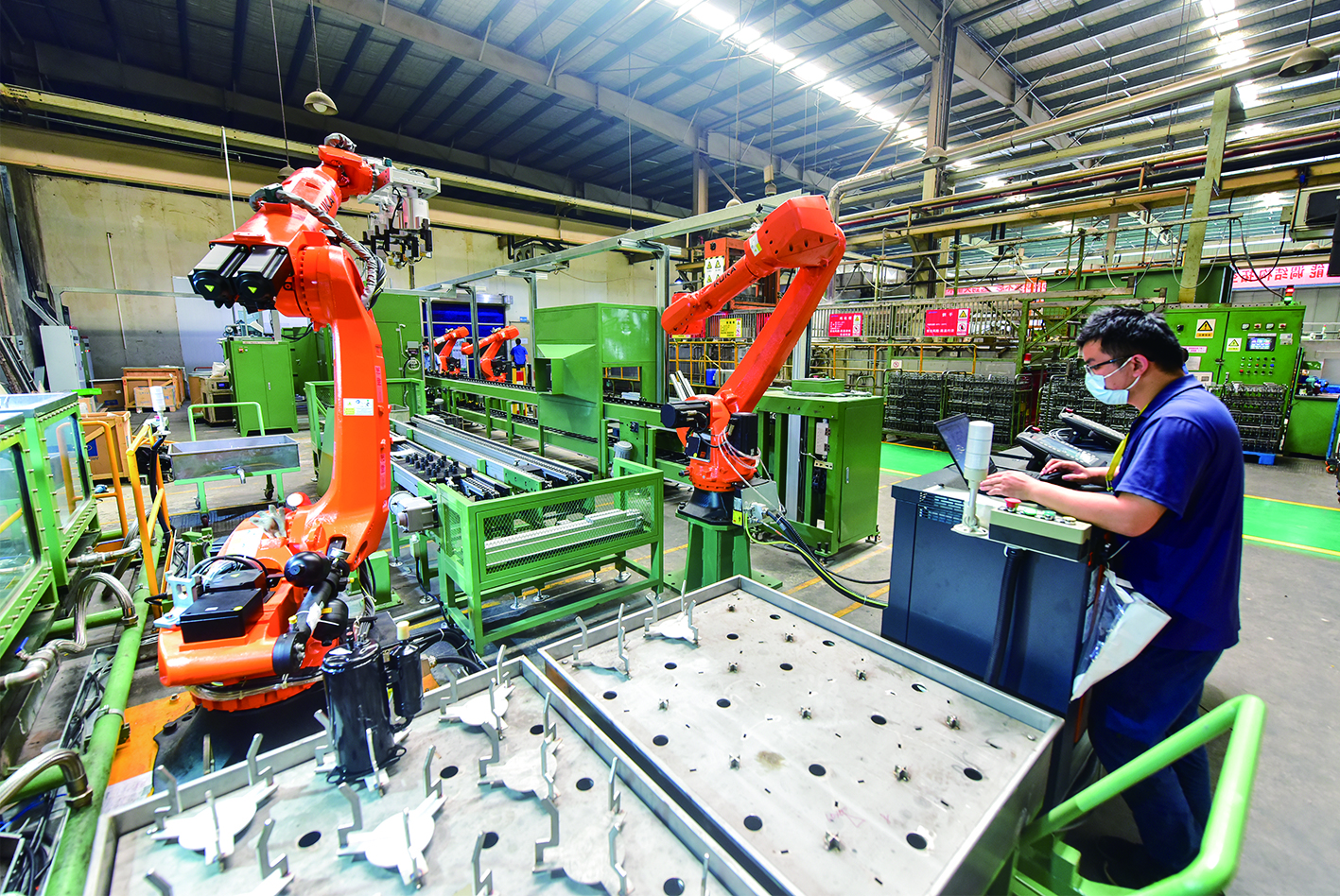 湖北东贝机电集团股份有限公司技术人员在调试机械臂。近年来,该公司坚持推进智能制造,生产线上更多的机器人和机械手代替了以往繁重的人工劳动,员工在缩减的同时,年产量从近2000万台提升到4000万台,劳动生产率大幅提升。(鄢巍 王飞)