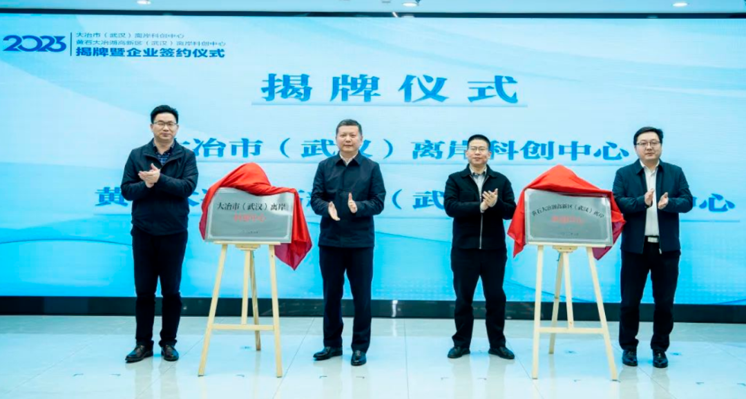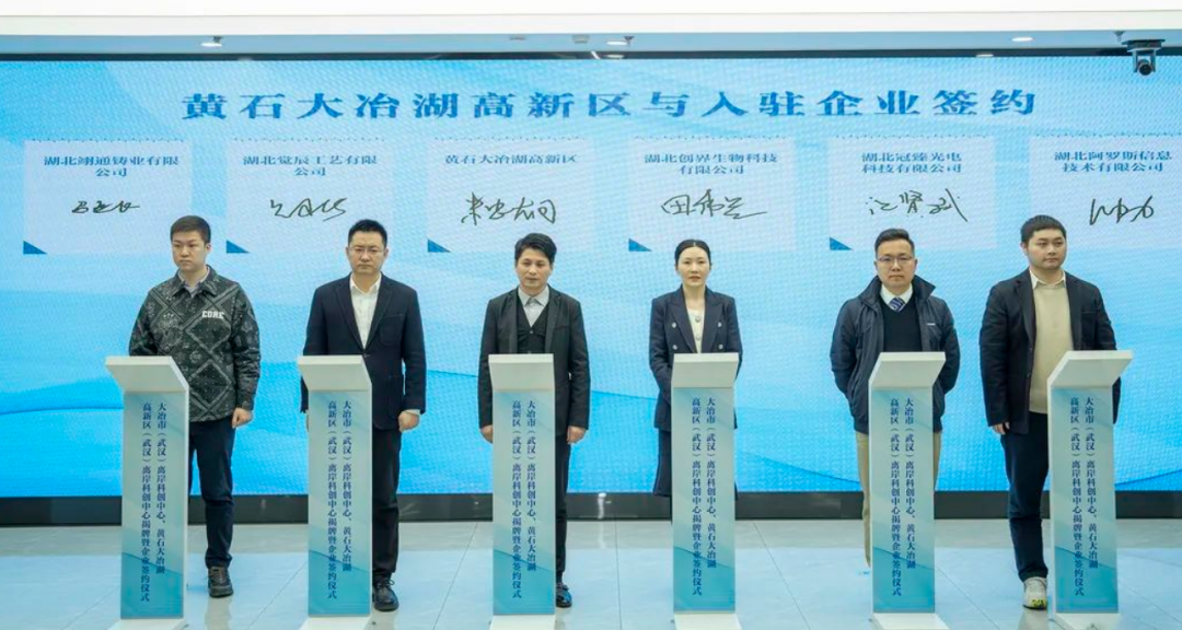 当天,创界生物、阿罗斯、冠臻光电、翊通铸业、觉辰工艺等5家大冶本土企业正式签约入驻离岸科创中心。